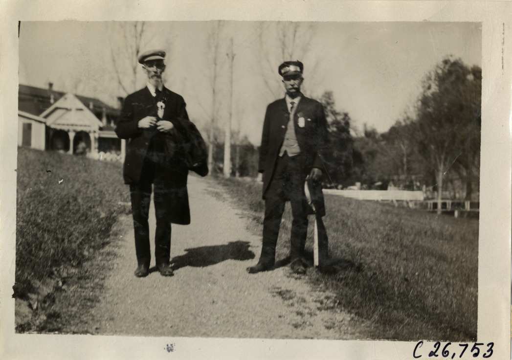 View of two men, possibly tour officials, posing on path during the 1909 New York to Atlanta Good Roads Tour. Stamped on back: "Spooner & Wells, Inc., photographers, telephones 3472-3473 Columbus, 1931 Broadway, New York." Handwritten on back: "Tours--New York-Atlanta Good Roads Tour, 1909."