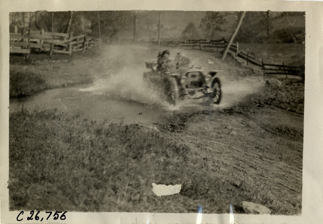 View of Joan Cuneo and passengers in Rainier press car traveling on flooded stretch of road during the 1909 New York to Atlanta Good Roads Tour. Stamped on back: "Spooner & Wells, Inc., photographers, telephones 3472-3473 Columbus, 1931 Broadway, New York." Handwritten on back: "Tours--New York-Atlanta Good Roads Tour, 1909."