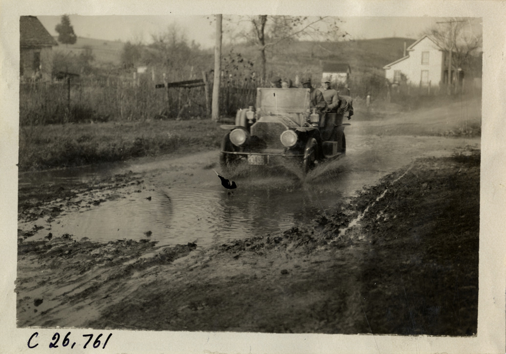 View of motorists in car on flooded stretch of road during the 1909 New York to Atlanta Good Roads Tour. Stamped on back: "Spooner & Wells, Inc., photographers, telephones 3472-3473 Columbus, 1931 Broadway, New York." Handwritten on back: "Tours--New York-Atlanta Good Roads Tour, 1909."