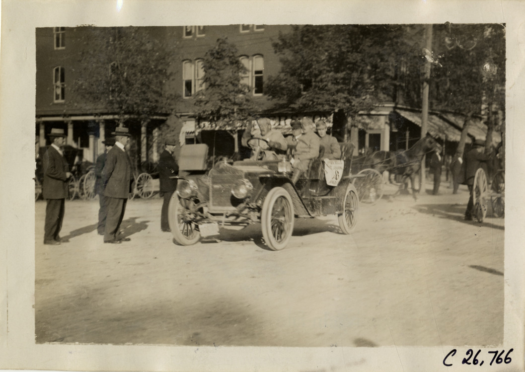 View of motorists in Chalmers-Detroit car no. 8 during the 1909 New York to Atlanta Good Roads Tour. Commercial buildings in background. Stamped on back: "Photo by Spooner & Wells, Inc. 1931 Broadway, N.Y." Handwritten on back: "Tours--New York-Atlanta Good Roads Tour, 1909."