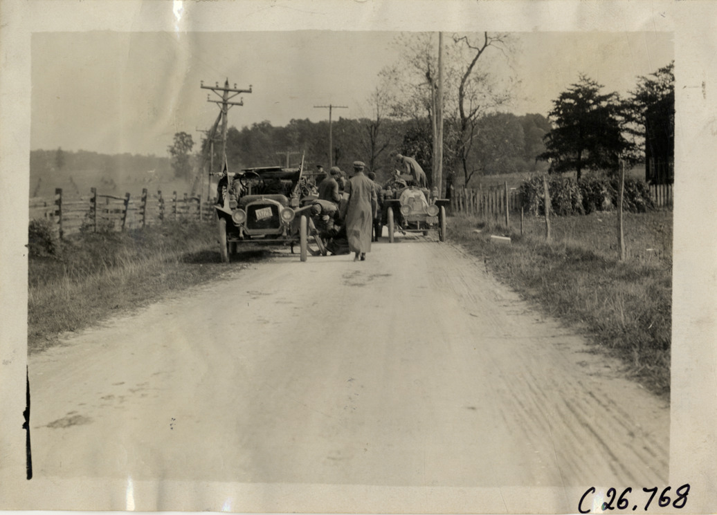 Motorists with automobiles on rural road, 1909 New York-Atlanta Good Roads Tour