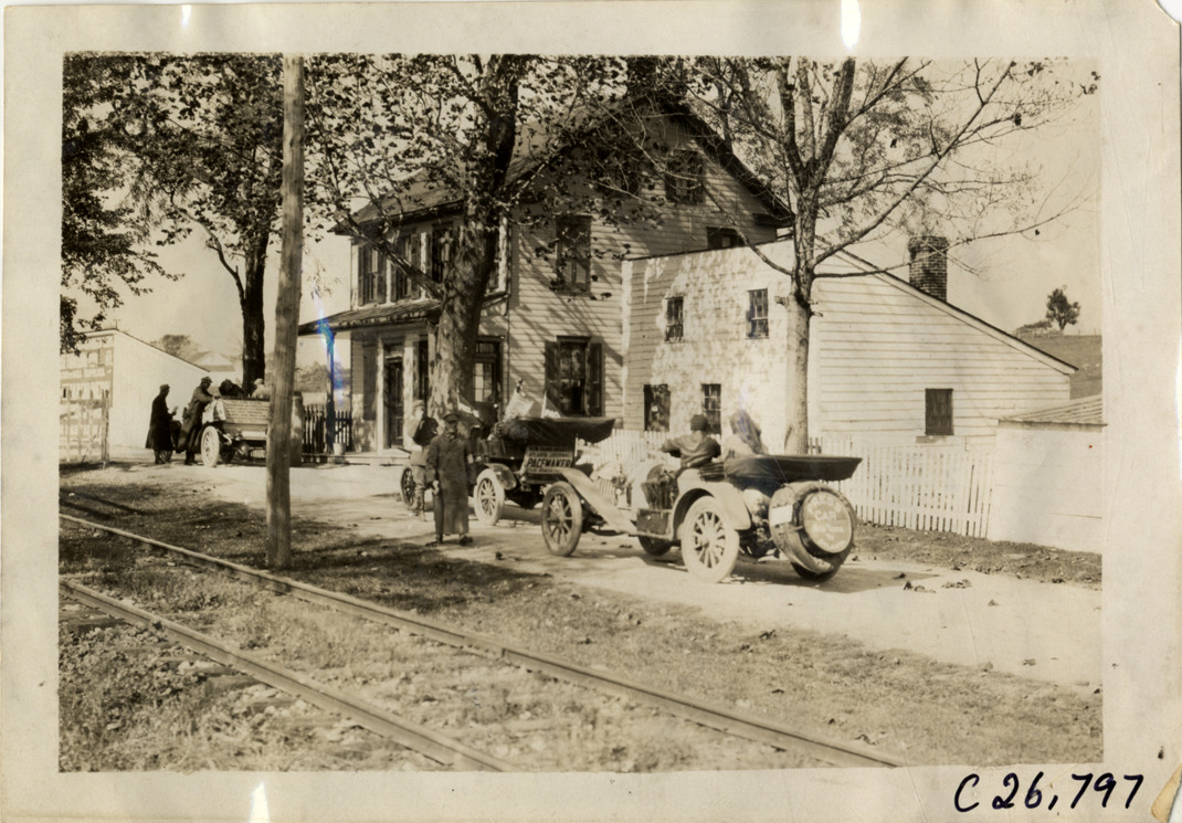 Rear view of pacemaker and press cars stopping at wooden-frame tollhouse during the 1909 New York to Atlanta Good Roads Tour. Railroad tracks in foreground; motorists with unidentified car in background. Stamped on back: "Photo by Spooner & Wells, Inc. 1931 Broadway, N.Y." Handwritten on back: "Tours--New York-Atlanta Good Roads Tour, 1909."
