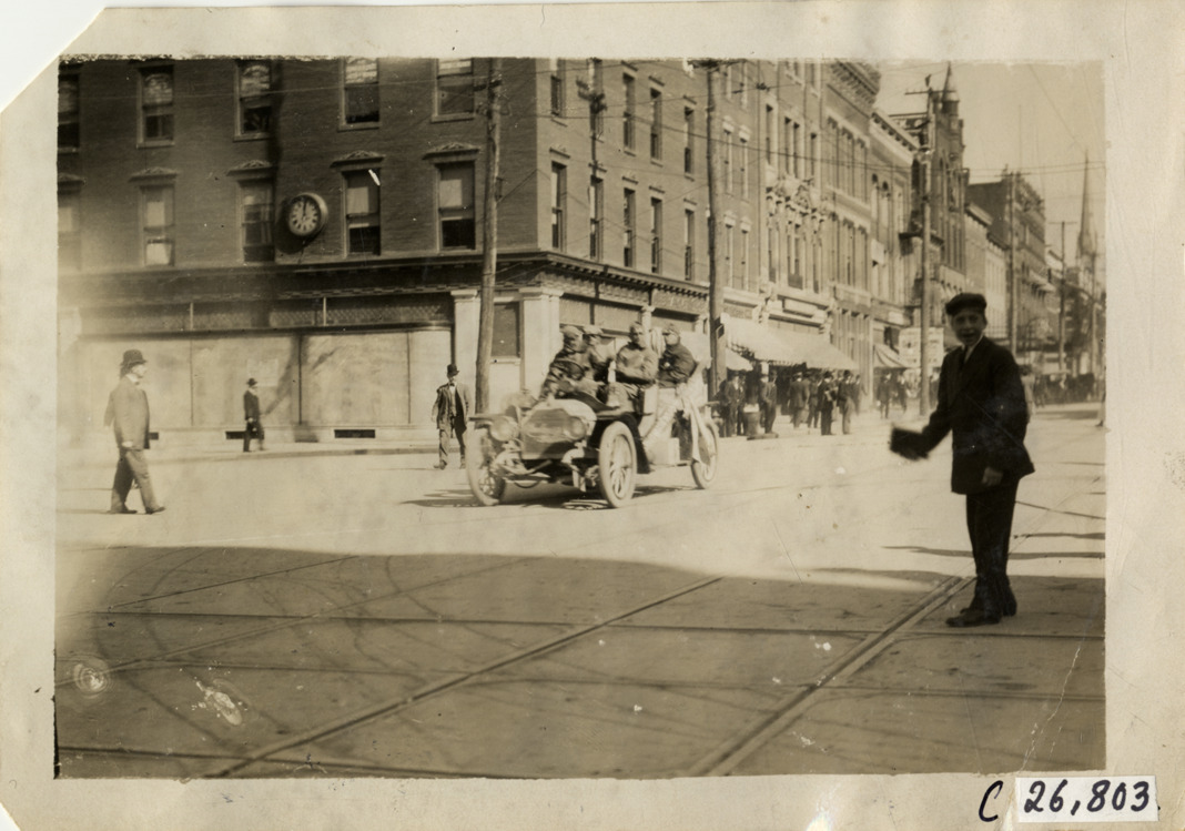 View of motorists in Chalmers-Detroit car traveling past commercial buildings during the 1909 New York to Atlanta Good Roads Tour. Boy stands in foreground. Stamped on back: "Photo by Spooner & Wells, Inc. 1931 Broadway, N.Y." Handwritten on back: "Tours--New York-Atlanta Good Roads Tour, 1909."