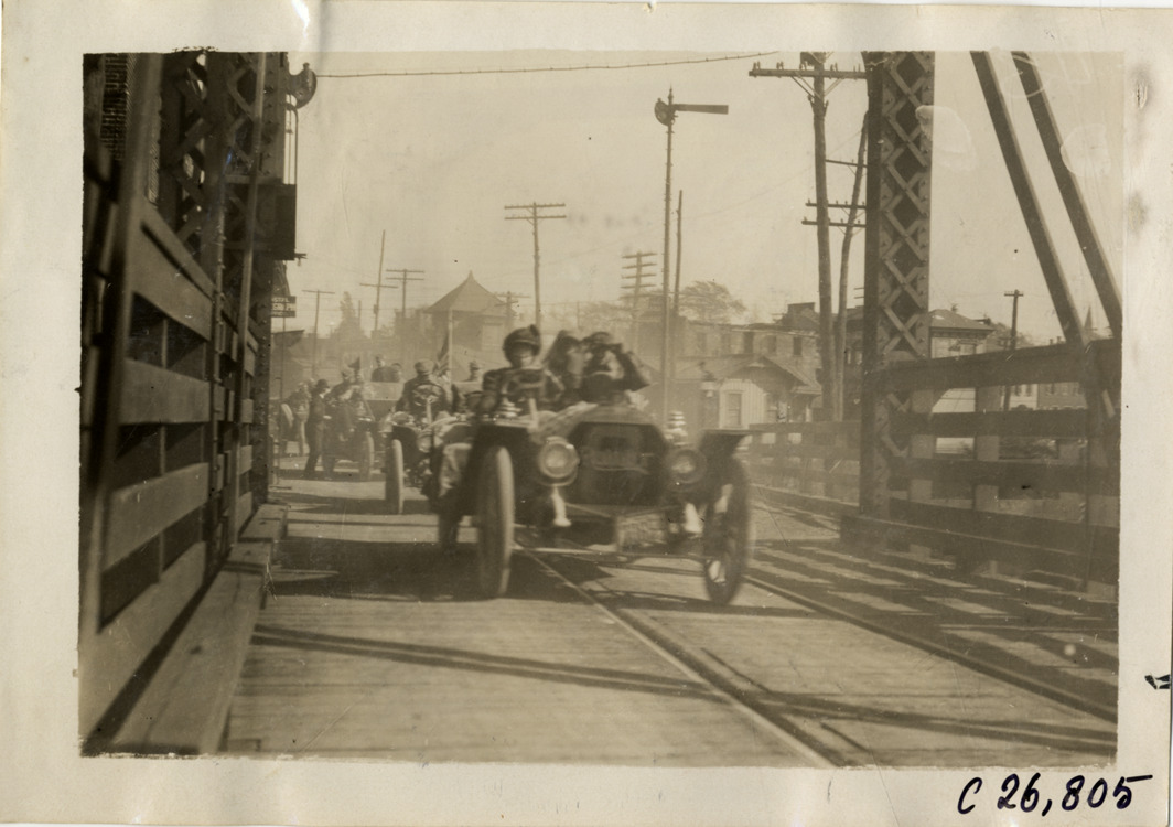 View of Joan Cuneo and motorists in Rainier press car crossing railroad bridge, followed by other cars, during the 1909 New York to Atlanta Good Roads Tour. Stamped on back: "Photo by Spooner & Wells, Inc. 1931 Broadway, N.Y." Handwritten on back: "Tours--New York-Atlanta Good Roads Tour, 1909."