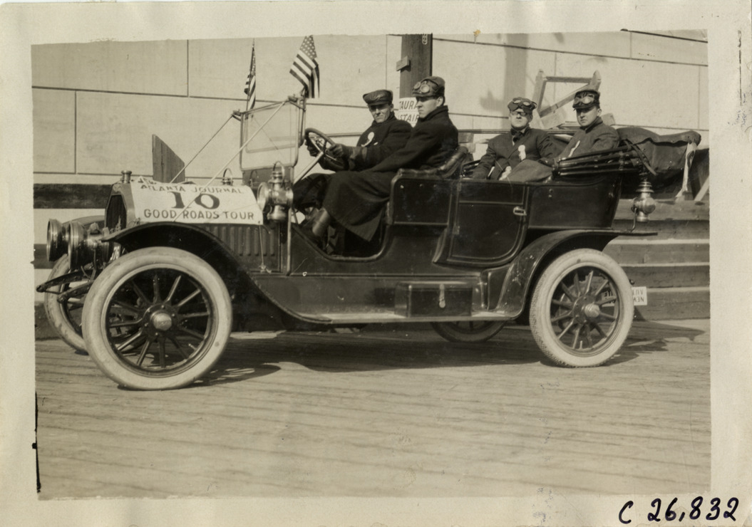 View of motorists posing in Buick car no. 10, waiting for the Staten Island ferry, during the 1909 New York to Atlanta Good Roads Tour. Wall in background. Stamped on back: "Photo by Spooner & Wells, Inc. 1931 Broadway, N.Y." Handwritten on back: "Tours--New York-Atlanta Good Roads Tour, 1909."