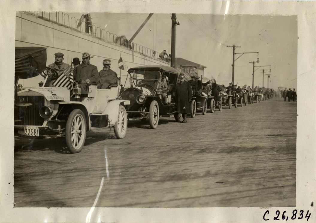 Automobiles waiting for Staten Island ferry, 1909 New York-Atlanta Good Roads Tour