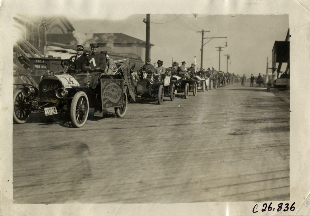 View of motorists in cars waiting for Staten Island ferry during the 1909 New York to Atlanta Good Roads Tour. Studebaker car no. 14 in foreground. Stamped on back: "Photo by Spooner & Wells, Inc. 1931 Broadway, N.Y." Handwritten on back: "Tours--New York-Atlanta Good Roads Tour, 1909."