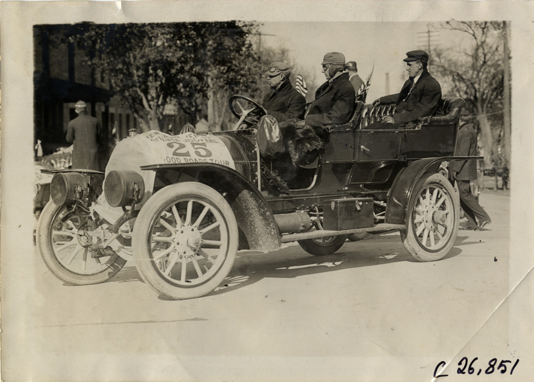 View of motorists in Pennsylvania car no. 25 during the 1909 New York to Atlanta Good Roads Tour. Stamped on back: "Photo by Spooner & Wells, Inc. 1931 Broadway, N.Y." Handwritten on back: "Tours--New York-Atlanta Good Roads Tour, 1909."
