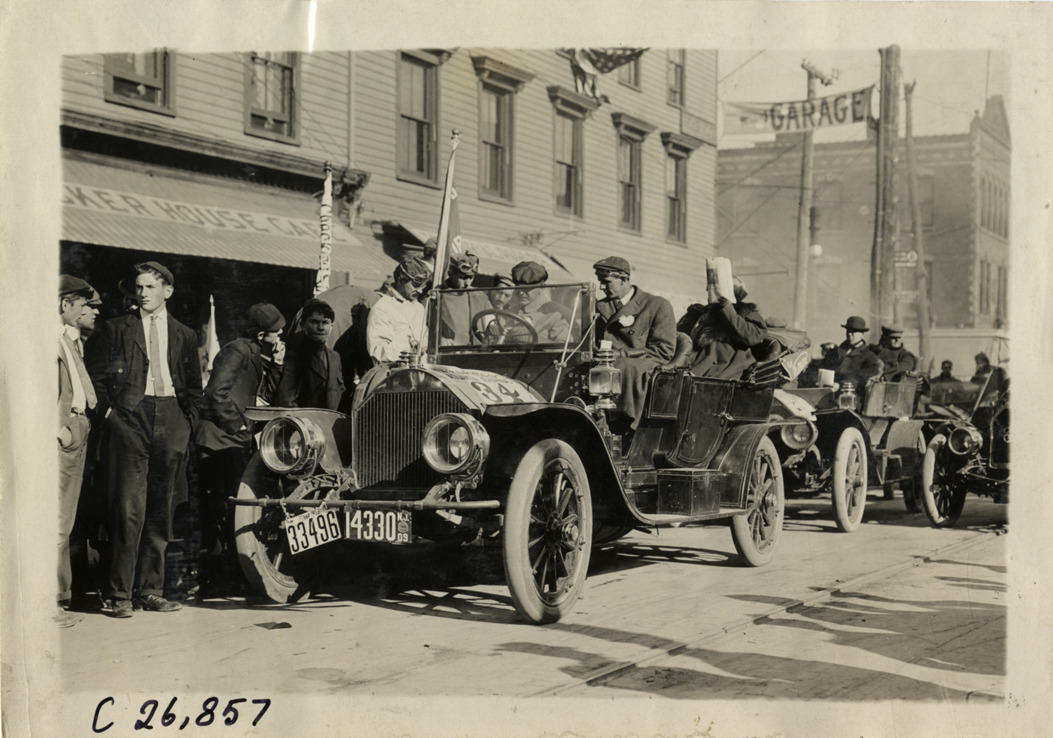 View of motorists Knox car no. 34 at Perth Amboy, New Jersey during the 1909 New York to Atlanta Good Roads Tour. Spectators on left; "Garage" banner and Packer House Cafe in background. Stamped on back: "Photo by Spooner & Wells, Inc. 1931 Broadway, N.Y." Handwritten on back: "Tours--New York-Atlanta Good Roads Tour, 1909."
