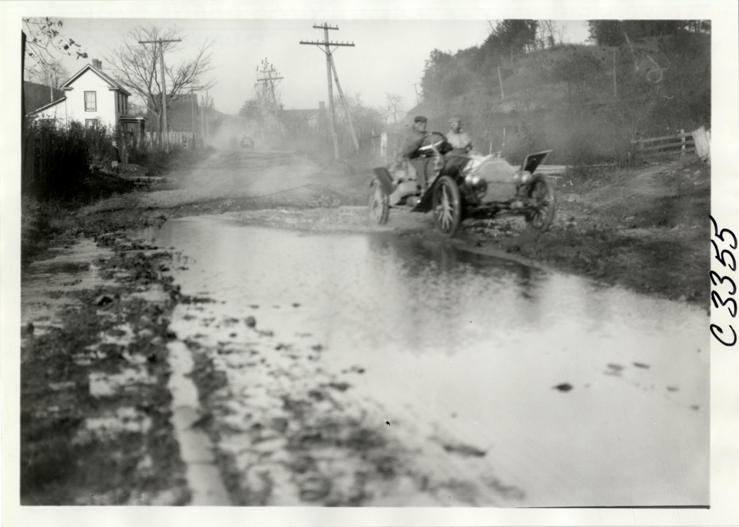 View of motorists in car on flooded stretch of road during the 1909 New York to Atlanta Good Roads Tour. Handwritten on back: "Tours--New York-Atlanta Good Roads Tour, 1909."