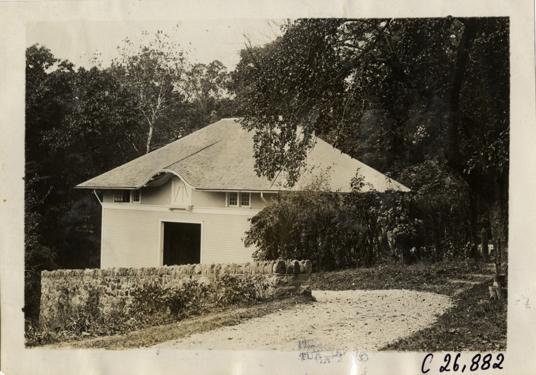 View of wooden-frame garage with hipped roof during the 1909 New York to Atlanta Good Roads Tour. Stone wall and driveway in foreground. Stamped on back: "Photo by Spooner & Wells, Inc. 1931 Broadway, N.Y." Handwritten on back: "Tours--New York-Atlanta Good Roads Tour, 1909."