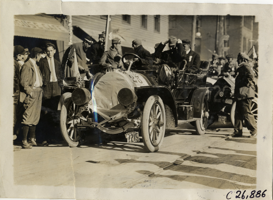 View of motorists in Pennsylvania car no. 25 at Perth Amboy, New Jersey during the 1909 New York to Atlanta Good Roads Tour. Packer House Cafe in background. Stamped on back: "Photo by Spooner & Wells, Inc. 1931 Broadway, N.Y." Handwritten on back: "Tours--New York-Atlanta Good Roads Tour, 1909."