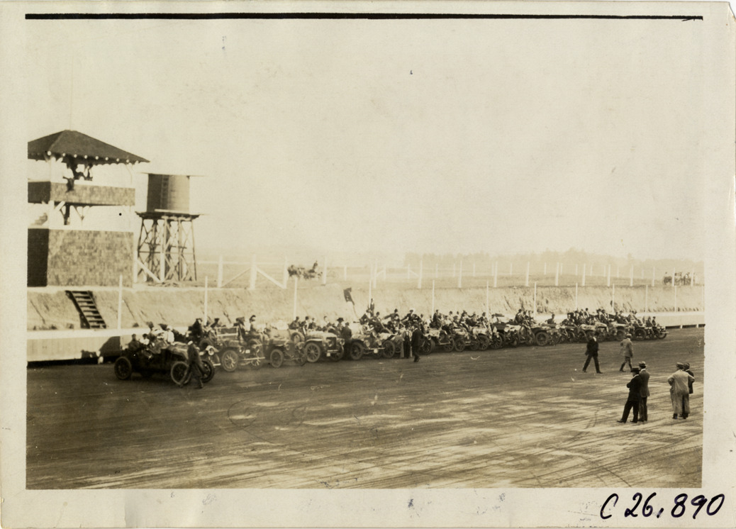 View of cars lined up on track at Atlanta Speedway in Georgia during the 1909 New York to Atlanta Good Roads Tour. Water tower and press stand in background. Stamped on back: "Spooner & Wells, Inc., photographers, telephones 3472-3473 Columbus, 1931 Broadway, New York." Handwritten on back: "Tours--New York-Atlanta Good Roads Tour, 1909."