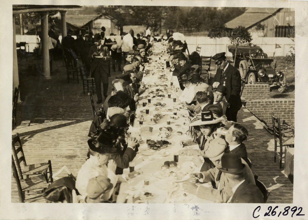View of motorists dining outdoors at long, cloth-covered table during the 1909 New York to Atlanta Good Roads Tour. Waiters serve guests; car parked in background. Stamped on back: "Spooner & Wells, Inc., photographers, telephones 3472-3473 Columbus, 1931 Broadway, New York." Handwritten on back: "Tours--New York-Atlanta Good Roads Tour, 1909."