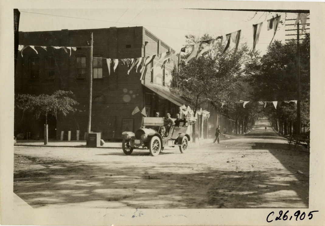 View of motorists in car at Decatur, Georgia during the 1909 New York to Atlanta Good Roads Tour. Flags are suspended over street; commercial buildings in background. Stamped on back: "Photo by Spooner & Wells, Inc. 1931 Broadway, N.Y." Handwritten on back: "Tours--New York-Atlanta Good Roads Tour, 1909."