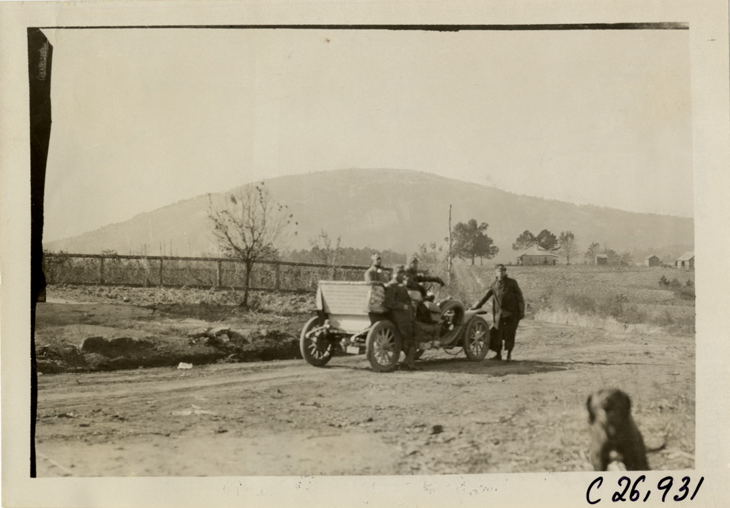 View of motorists posing with car on rural dirt road during the 1909 New York to Atlanta Good Roads Tour. Fence and farm buildings in background. Stamped on back: "Photo by Spooner & Wells, Inc. 1931 Broadway, N.Y." Handwritten on back: "Tours--New York-Atlanta Good Roads Tour, 1909."