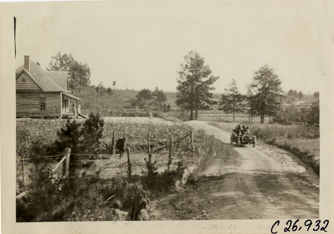 View of motorists in car traveling on rural dirt road during the 1909 New York to Atlanta Good Roads Tour. Wooden-frame house on roadside. Stamped on back: "Photo by Spooner & Wells, Inc. 1931 Broadway, N.Y." Handwritten on back: "Tours--New York-Atlanta Good Roads Tour, 1909."