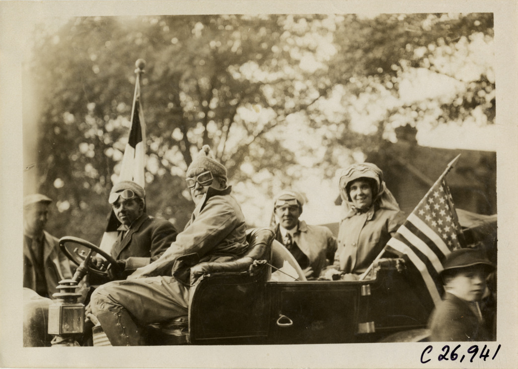 Close-up view of motorists posing in car during the 1909 New York to Atlanta Good Roads Tour. Stamped on back: "Spooner & Wells, Inc., photographers, telephones 3472-3473 Columbus, 1931 Broadway, New York." Handwritten on back: "Tours--New York-Atlanta Good Roads Tour, 1909."