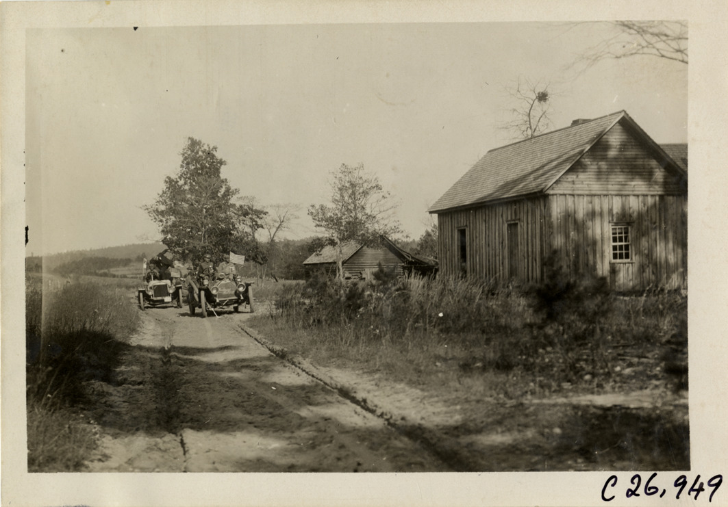 View of motorists in two cars traveling on rural dirt road during the 1909 New York to Atlanta Good Roads Tour. Board-and-batten house and log cabin on roadside. Stamped on back: "Photo by Spooner & Wells, Inc. 1931 Broadway, N.Y." Handwritten on back: "Tours--New York-Atlanta Good Roads Tour, 1909."