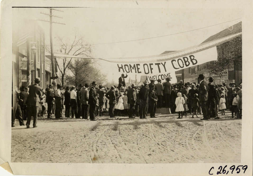 View of crowd standing under "Home of Ty Cobb, welcome" banner at Royston, Georgia during the 1909 New York to Atlanta Good Roads Tour. Stamped on back: "Photo by Spooner & Wells, Inc. 1931 Broadway, N.Y." Handwritten on back: "Tours--New York-Atlanta Good Roads Tour, 1909."