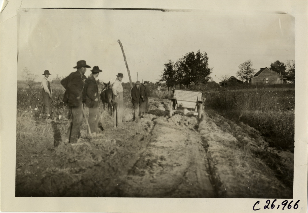 Rear view of car traveling on rutted rural dirt road during the 1909 New York to Atlanta Good Roads Tour. Onlookers stand on roadside. Stamped on back: "Photo by Spooner & Wells, Inc. 1931 Broadway, N.Y." Handwritten on back: "Tours--New York-Atlanta Good Roads Tour, 1909."