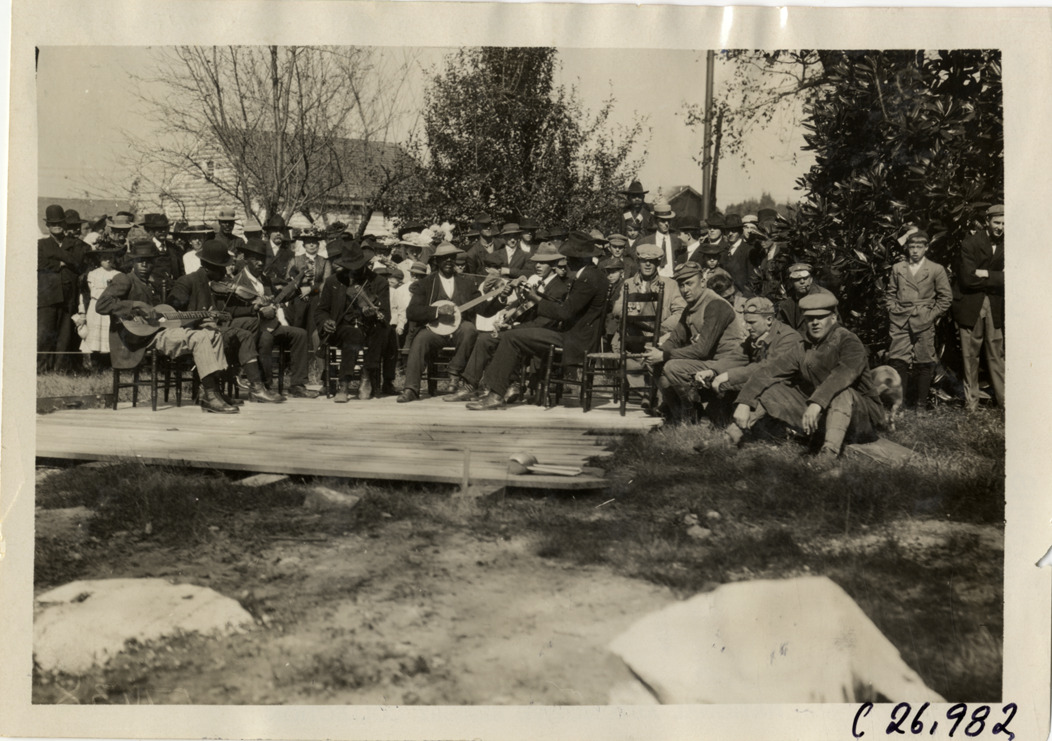 View of musicians performing outdoors on wooden platform during the 1909 New York to Atlanta Good Roads Tour. Men play banjo, violins and guitar. Spectators in background. Stamped on back: "Photo by Spooner & Wells, Inc. 1931 Broadway, N.Y." Handwritten on back: "Tours--New York-Atlanta Good Roads Tour, 1909."