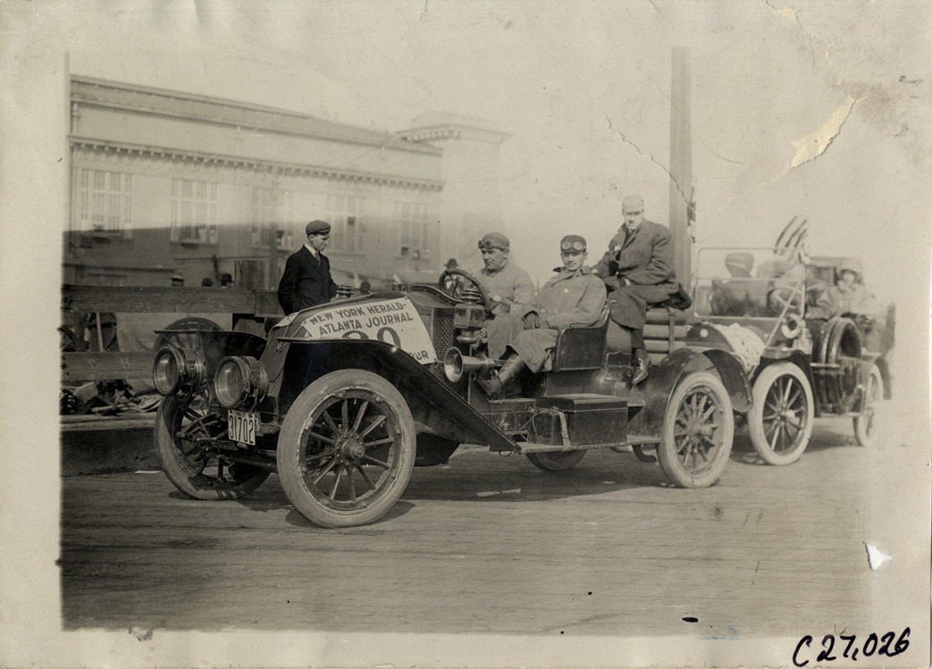 View of motorists posing in Renault car no. 30 during the 1909 New York to Atlanta Good Roads Tour. Stamped on back: "Photo by Spooner & Wells, Inc. 1931 Broadway, N.Y." Handwritten on back: "Tours--New York-Atlanta Good Roads Tour, 1909."