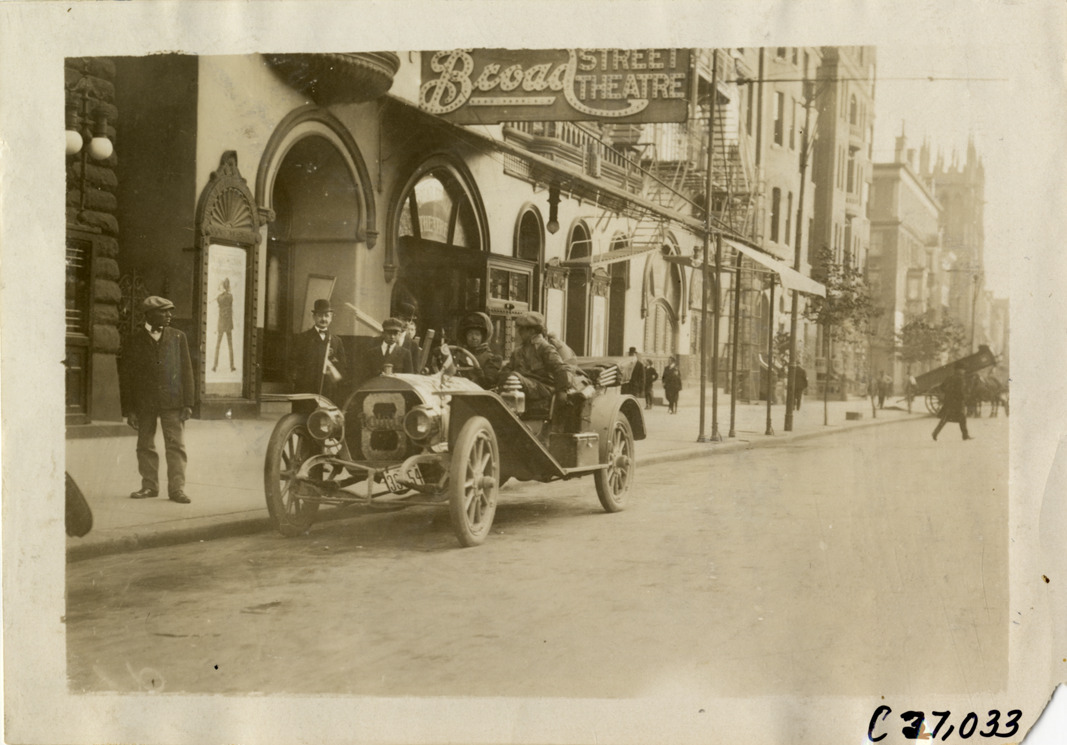 View of Joan Cuneo and passenger in Rainier press car in front of the Broad Street Theatre at Philadelphia, Pennsylvania during the 1909 New York to Atlanta Good Roads Tour. Stamped on back: "Photo by Spooner & Wells, Inc. 1931 Broadway, N.Y." Handwritten on back: "Tours--New York-Atlanta Good Roads Tour, 1909."