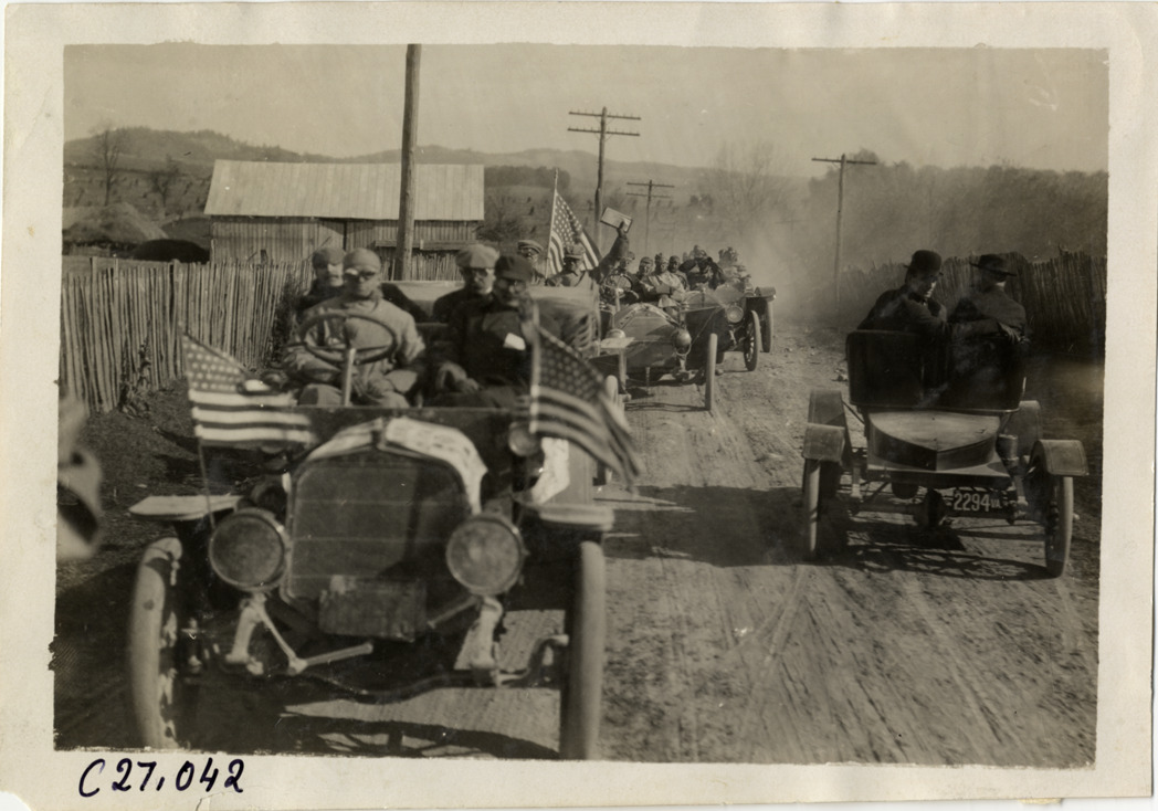 Automobiles lined up on rural road, 1909 New York-Atlanta Good Roads Tour