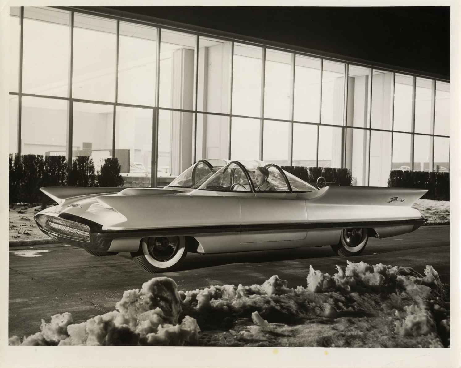 View of driver posing in 1955 Lincoln Futura experimental car. Typed on back: "Against a background of the styling studios where it was conceived, the Lincoln Futura provides a hint of things to come in the automotive world. Designed by the Lincoln car stylists at Ford Motor Company's Engineering Center in Dearborn, Michigan, the Futura is a laboratory on wheels from which Lincoln-Mercury Division seeks to obtain valuable engineering data and test public reaction to styling innovations. #1302-h, Neg. 106511, 55222. Public Relations Department, Lincoln-Mercury Division, Ford Motor Company, 6200 West Warren Avenue, Detroit 32, Michigan, TYler 8-9800."