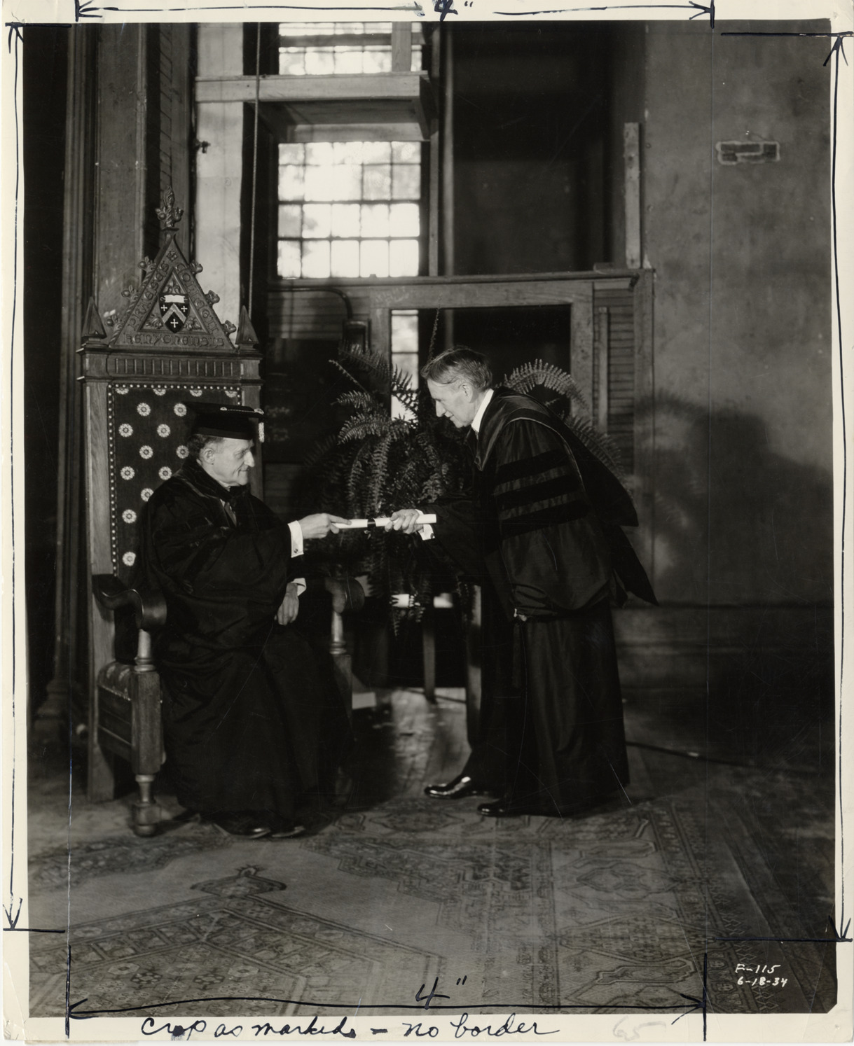 View of Harvey S. Firestone, founder of the Firestone Tire and Rubber Company, receiving an honorary Doctor of Laws degree from college president Dr. William Foster Pierce at Kenyon College in Ohio. Printed on front: "6-18-34." Typed on back: "Harvey S. Firestone receives the honorary degree of Doctor of Laws at the 106th commencement of Kenyon College from Dr. William Foster Pierce, president of the College."