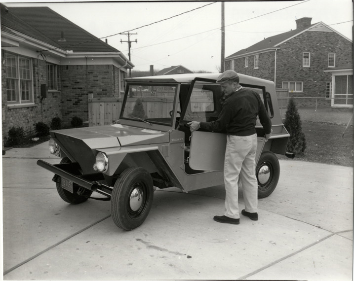View of Arnold P. Saviano demonstrating removable doors on the 1960 Saviano Scat utility car. Brick houses in background. Handwritten on back: "1960 Scat by Saviano Veh. Inc. shown w/ Arnold P. Saviano. Removeable [sic] doors."