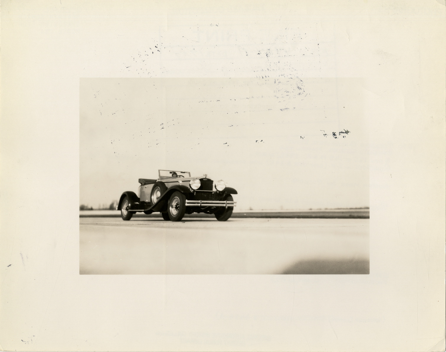 View of 1930 Packard Speedster Eight car, Seventh Series, Model 734 at Packard Proving Grounds in Utica, Michigan. Typed on back: "Packard, 1930, Seventh Series, Speedster Eight, Model 734. Car tests on track, speedster on track." Handwritten on back: "1930 Packard Speedster Eight, Seventh Series, Model 734. 8 cy., 125 or 145 b.h.p., 134-1/2", wh 13. Runabout, 2 p. (body-type #442) with staggered seats, tapered tail design. Custom made by Packard. Packard radiator script a la export models. Setting: Packard Proving Grounds, Utica, Michigan. Photographed: October 1929."