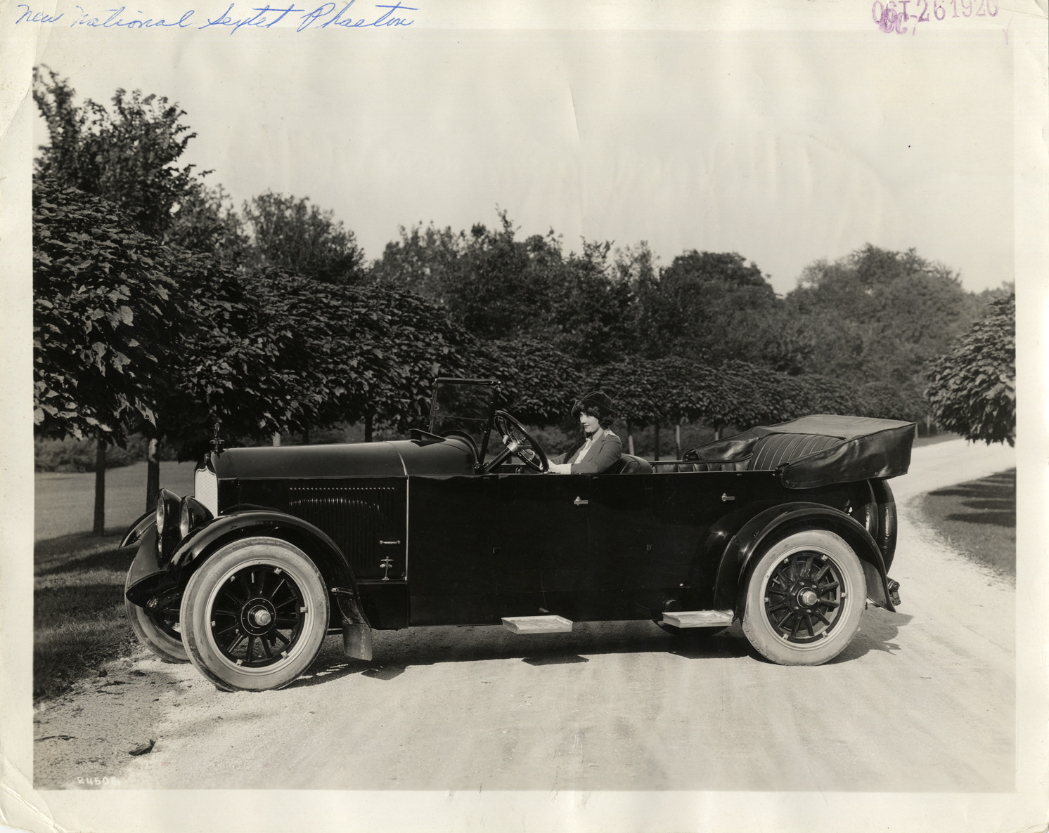 View of woman posing in 1921 National Sextet phaeton car. Handwritten on front: "New National Sextet phaeton." Typed on back: "The new National Sextet phaeton, with cast aluminum steps in place of running boards, appears to hug the ground in the manner characteristic of the finest European cars, yet standard road clearance is maintained. The unusually low effect has been secured through the exclusive method of body mounting followed by National, in which the body is suspended on brackets riveted below the upper edge of the chassis frame, dropping the body sides several inches closer to the ground. In the year that has followed the introduction of this method of body mounting, it has proved itself not only a source of beauty but of riding comfort as well. Squeaks and rattles are banished through the increased rigidity of the body support, the sills being laid on edge, instead of flat, and overlapping the chassis frame."