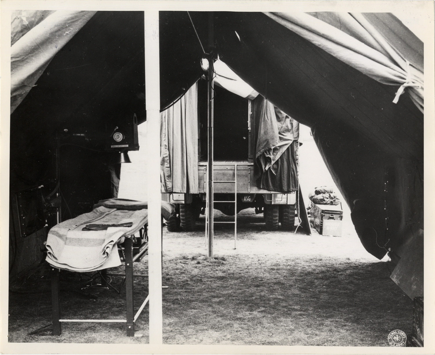View of mobile x-ray unit and cot inside tent at United States Medical Field Service School somewhere in the European Theater of Operations. Rear of military truck in background. Printed on front: "Signal Corps, U.S. Army." Typed on back: "Overall interior view of mobile x-ray unit tent at the medical field service school in the ETO." Stamped on back: "Signal Corps photo, please credit. Released for publication by Bureau of Public Relations, War Department."