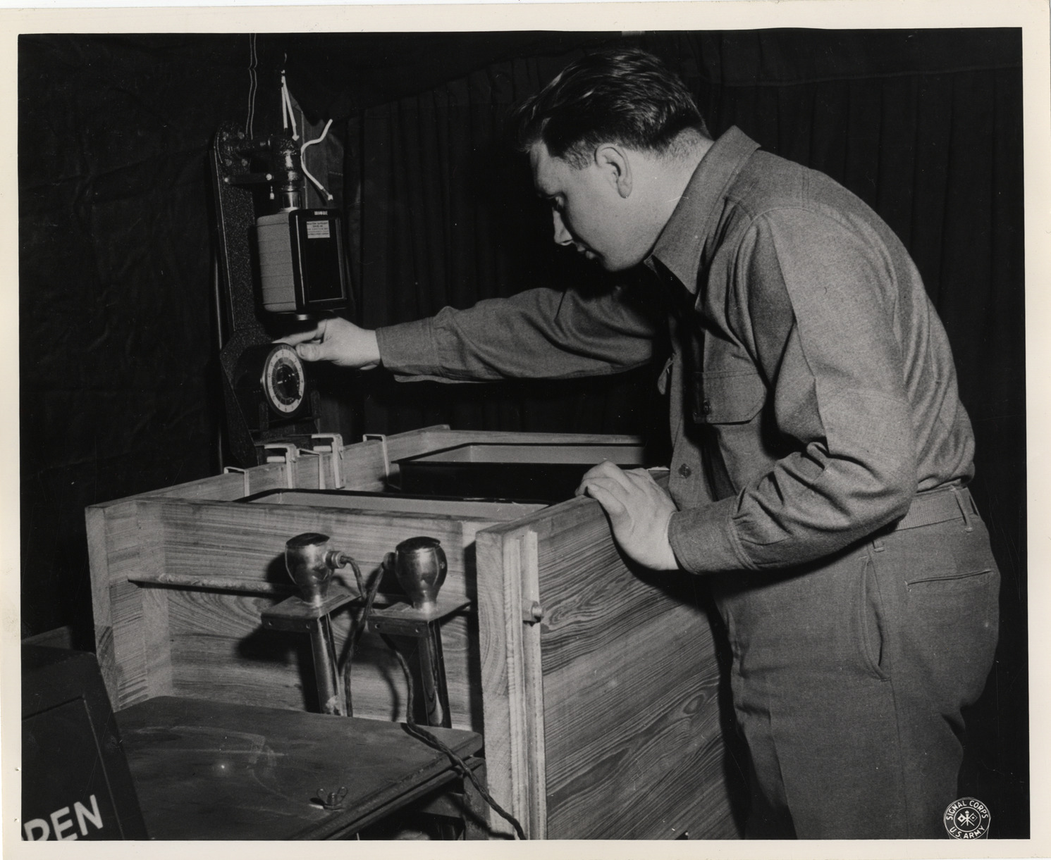 View of technician adjusting controls on developing tank inside mobile x-ray unit truck at United States Medical Field Service School somewhere in the European Theater of Operations. Printed on front: "Signal Corps, U.S. Army." Typed on back: "View of interior of truck with technician at developing tanks, part of the equipment of a mobile x-ray unit of the medical field service school somewhere in the ETO."