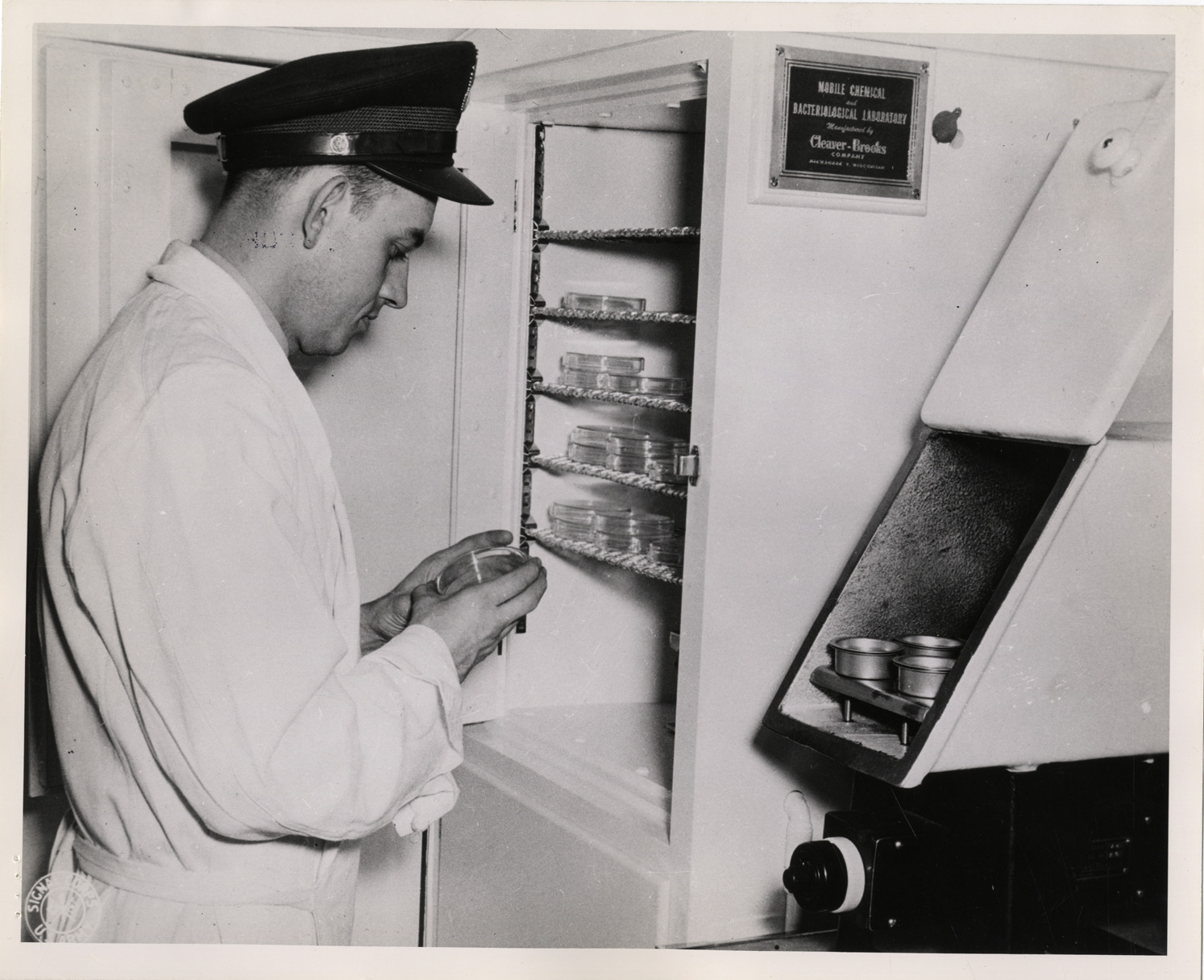 View of Captain Hatton B. Rogers, food technologist, at the Mobile Chemical and Bacteriological Laboratory of the Quartermaster Corps. Hatton places petri dish containing bacteriological specimen inside incubator. Plaque on incubator reads: "Mobile Chemical and Bacteriological Laboratory manufactured by Cleaver-Brooks Company, Milwaukee, Wisconsin." Printed on front: "Signal Corps, U.S. Army." Typed on back: "Captain Hatton B. Rogers, food technologist, places plate containing bacteriological specimen from processed food in electrically controlled incubator to determine bacteriological count. These plates are kept in incubator twenty-four to forty-eight hours at temperatures from 98 degrees. Below is freezing compartment used to store frozen foods and certain chemicals which keep better at low termperatures. At right is a vacuum oven which determines moisture content, in dehydrated foods." Stamped on back: "Signal Corps photo, please credit. Released for publication by Bureau of Public Relations, War Department."