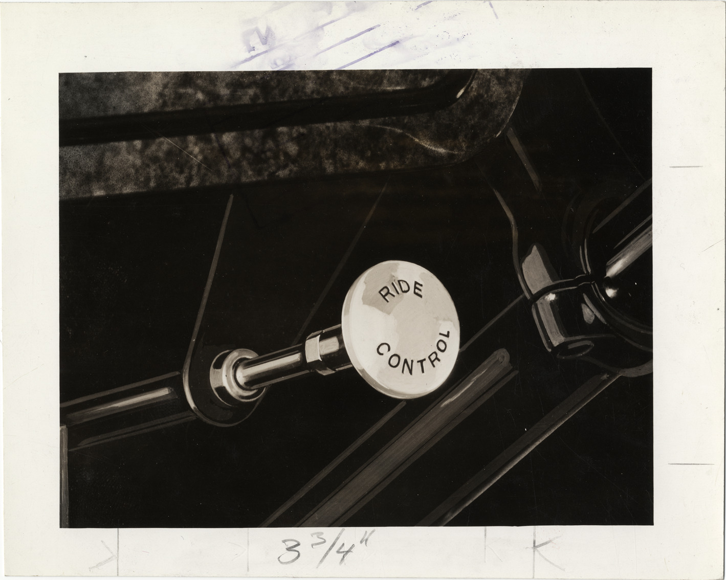 Artist's depiction of ride control adjustment on 1933 Packard Eight car, Tenth Series, Model 1002. Handwritten on back: "1933 Packard Eight, Tenth Series, Model 1002. 8 cy., 120 b.h.p., 136" whb., coupe ~ 2/4-p. (body-type #618). Detail: ride control adjustment. Note: this photograph used for spot illustration in both the 1933 Tenth Series Eight (1001-1002) & Super Eight (1003-1004) catalogues. Ride control, original neg. made over 1002 ~ 2 pass. coupe, 2798C, Jan. 33."