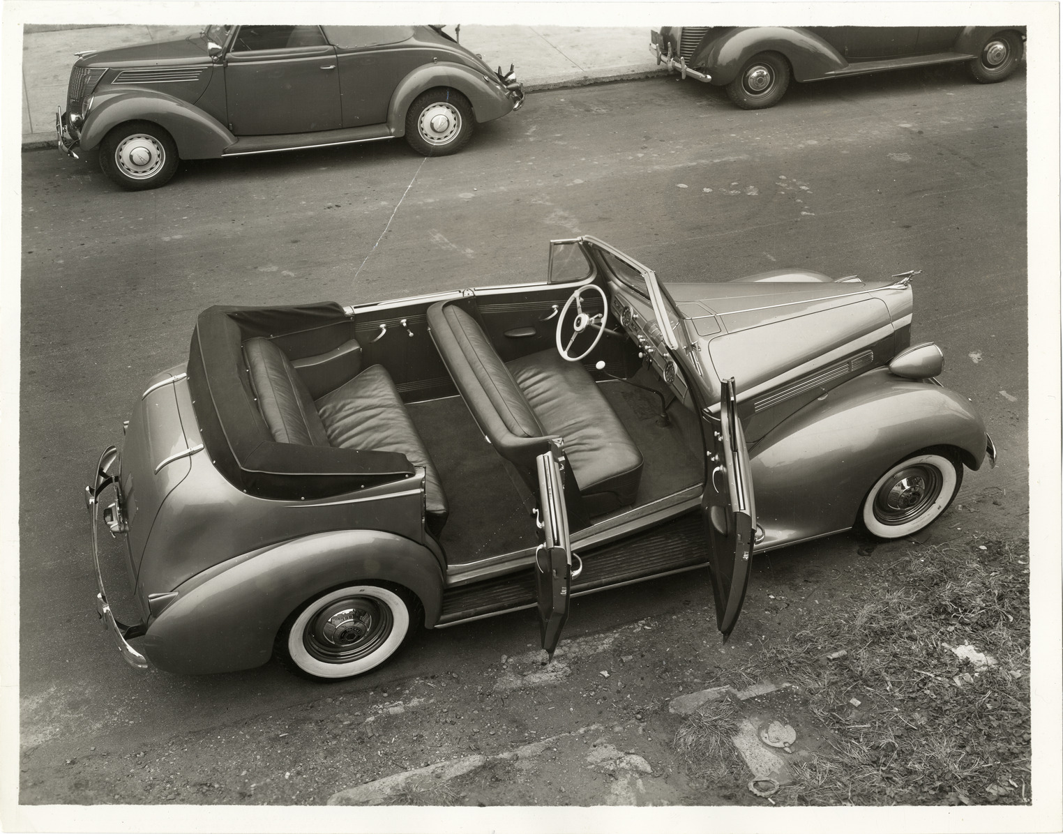 Favorite this☆ 1938 Packard Eight automobile Description: Overhead view of 1938 Packard Eight convertible car, Sixteenth Series, Model 1601. Handwritten on back: "1938 Packard Eight, Sixteenth Series, Model 1601, 8 cy., 120 b.h.p., 127" whb., convertible sedan ~ 5 pass. (body-type #1197). Note: License plate frame, white sidewall tires, wheel trim 'beauty rings,' Packard DeLuxe emblem, DeLuxe steering wheel, DeLuxe knob for gear shift lever, cigar light, clock, radio. Background: Left, 1937 Ford V8/85, Model 78 Deluxe, 8 cy., 85 b.h.p., Deluxe convertible Club Cabriolet. Right, 1937 Terraplane. Original photograph by John Adams Davis, New York." Details Resource ID: na030080 Creator: Davis, John Adams Subject: Packard automobile Automobiles, Convertible Photographers--New York (State)--New York Photographic prints Date Issued: 1937-12-02 Format: 1 photographic print ; 8 x 10 in. Member of: National Automotive History Collection Packard Collection Filing Location: 1938, Sixteenth Series, Model 1601, folder no. 4 Negative Number: 2899-F Rights: Physical rights are retained by DPL. Copyright is retained in accordance with U.S. copyright laws.