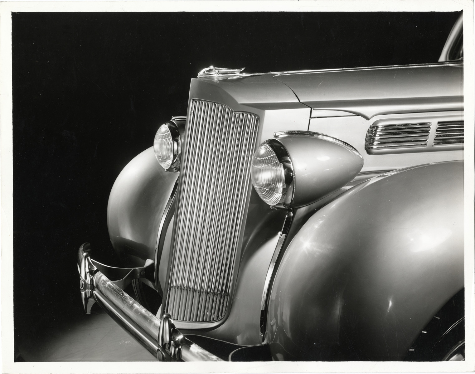 Close-up view of front end of 1938 Packard Eight car, Sixteenth Series, Model 1601, showing radiator grille, hood ornament and headlights. Typed/stamped on back: "Neg. no. 2274-F, Date: 5-26-37, Main guide: 120, Sub. guide: front end views." Handwritten on back: "1938 Packard Eight, Sixteenth Series, Model 1601, 8 cy., 120 b.h.p., 127" whb., touring sedan, 2-door ~ 5 pass. (body-type #1194). Prototype. Detail: front from left. Note: Non-production bumpers, bumper guards (painted center stripe & areas around hexagons on bumper guards)."