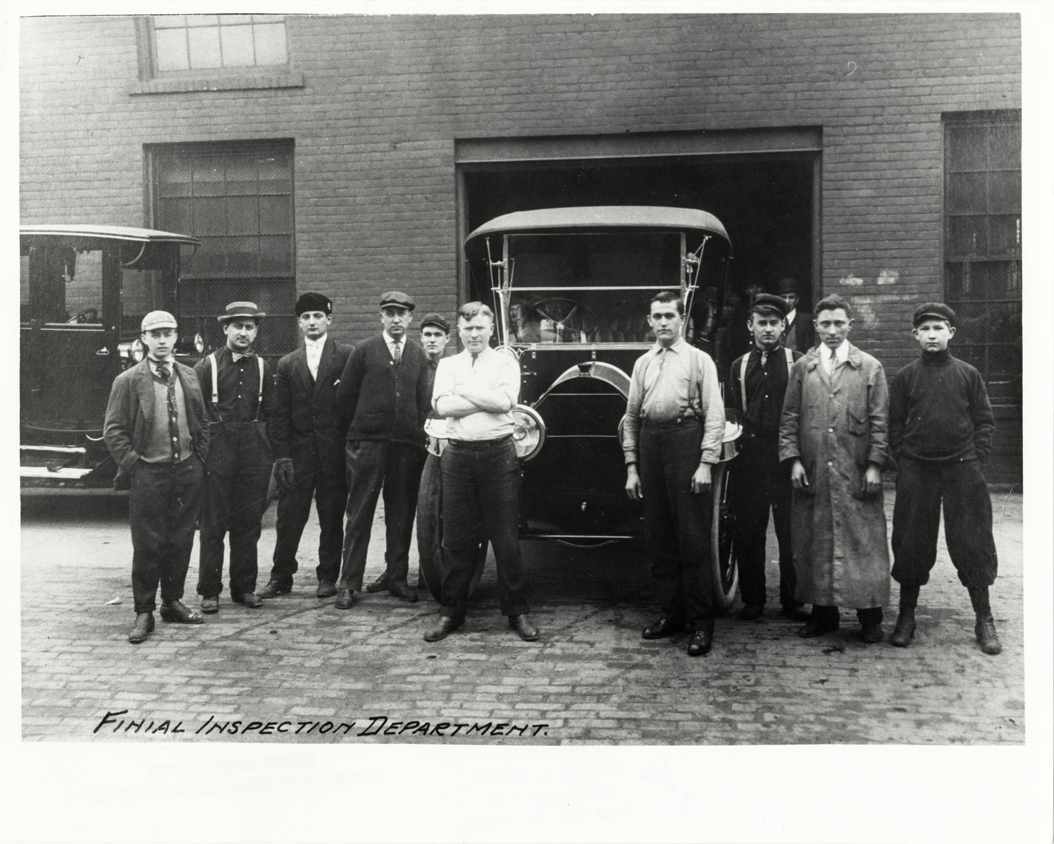 Members of Final Inspection Department posing with 1912 Cadillac automobile