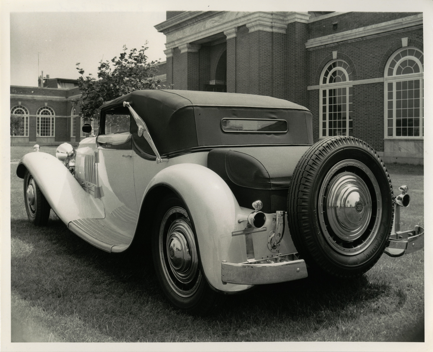 View of 1930 Bugatti Royale car in front of the Henry Ford Museum in Dearborn, Michigan. Stamped on back: "The Henry Ford Museum, Dearborn, Michigan 48121."