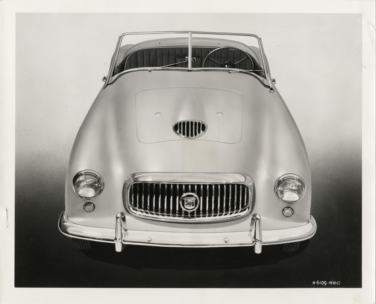 Front view of 1951 Nash Healey sports car. Typed on back: "Public Relations Department, Nash Motors Division, Nash-Kelvinator Corporation, Detroit 32, Michigan. For release February 15, 1951. The distinctive front end appearance of Nash Motors new Nash Healey sports car is achieved by clean functional design with a broad low hood and car-long horizontal body lines that flow gracefully from front to rear. Front grille follows the design of the familiar Nash "Airflyte" chrome barred racing air scoop. The sports car is powered by a new 'Dual Jetfire' Ambassador engine having an estimated speed of 125 mph. The new car will be tested soon at the Indianapolis Speedway, Daytona and the Salt Lake Flats."
