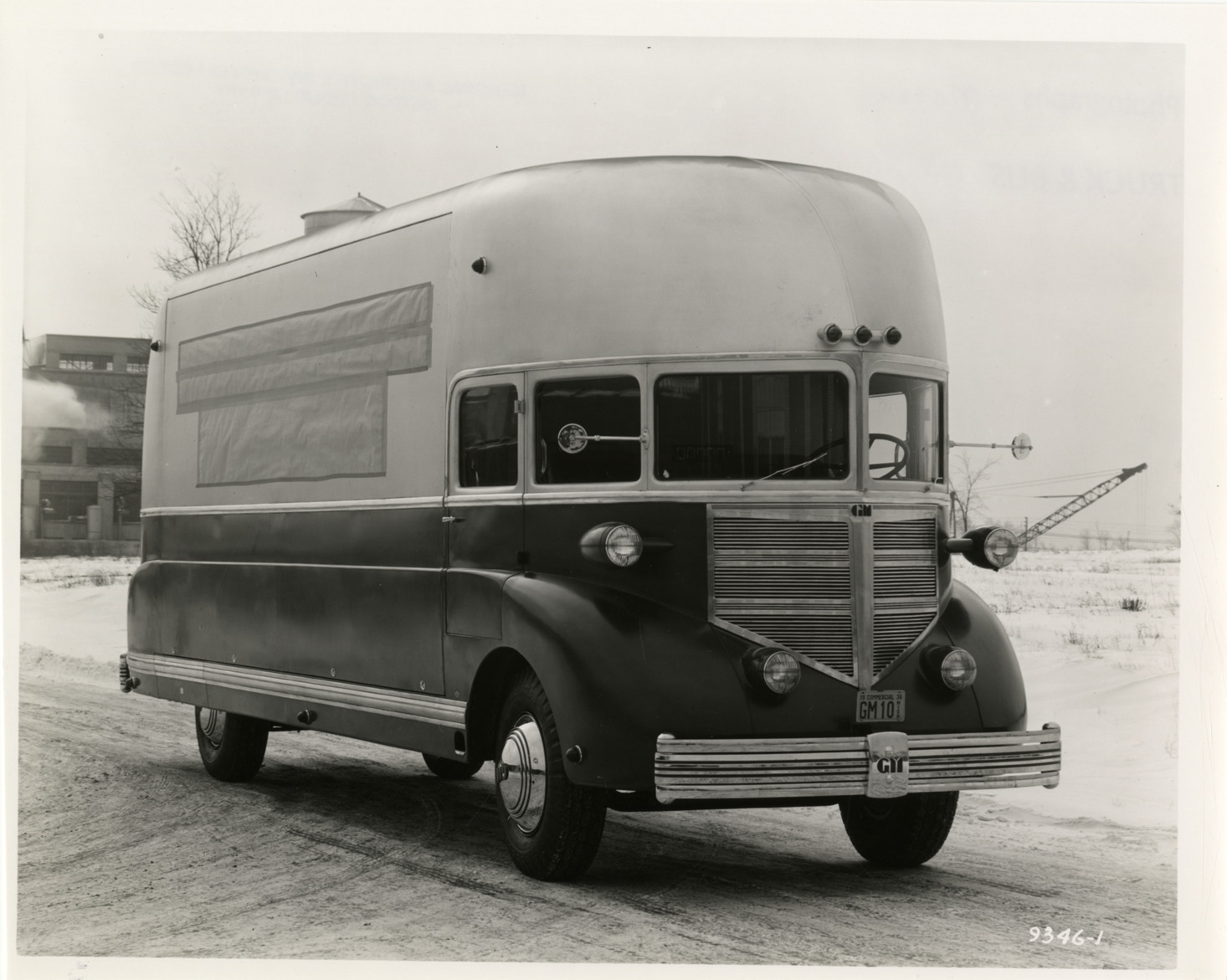 View of truck built for the General Motor Parade of Progress traveling exhibition, with T-74 cab-over-engine (COE) chassis. Handwritten on back: "Blt. for GM Parade of Progress, T-74 COE chassis, 1-26-36."