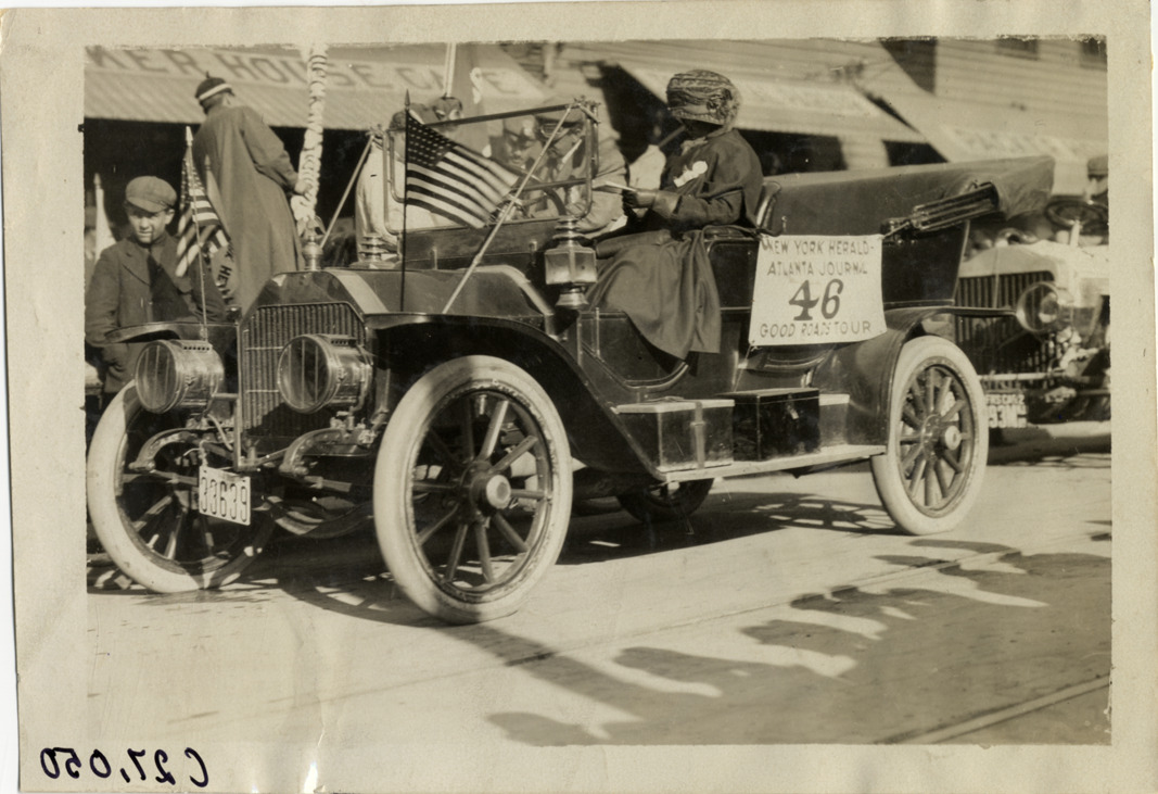 View of motorists in Oldsmobile car no. 46 during the 1909 New York to Atlanta Good Roads Tour. Stamped on back: "Photo by Spooner & Wells, Inc. 1931 Broadway, N.Y." Handwritten on back: "Tours--New York-Atlanta Good Roads Tour, 1909." Image is reversed.