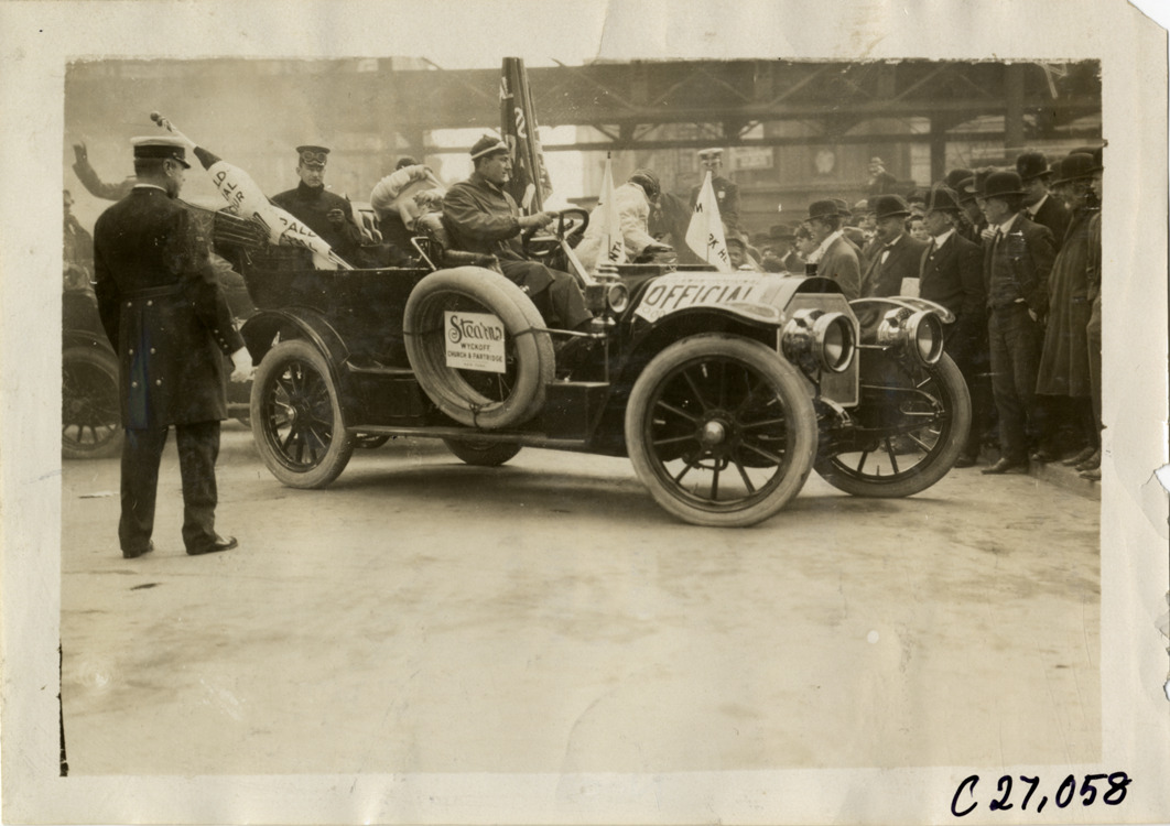 Motorists in Stearns official automobile, 1909 New York-Atlanta Good Roads Tour