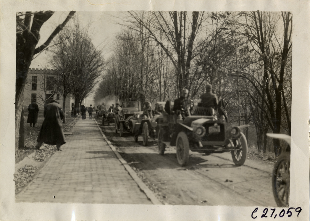 View of motorists in cars lined up on tree-lined street during the 1909 New York to Atlanta Good Roads Tour. Brick sidewalk on left. Stamped on back: "Spooner & Wells, Inc., photographers, telephones 3472-3473 Columbus, 1931 Broadway, New York." Handwritten on back: "Tours--New York-Atlanta Good Roads Tour, 1909."