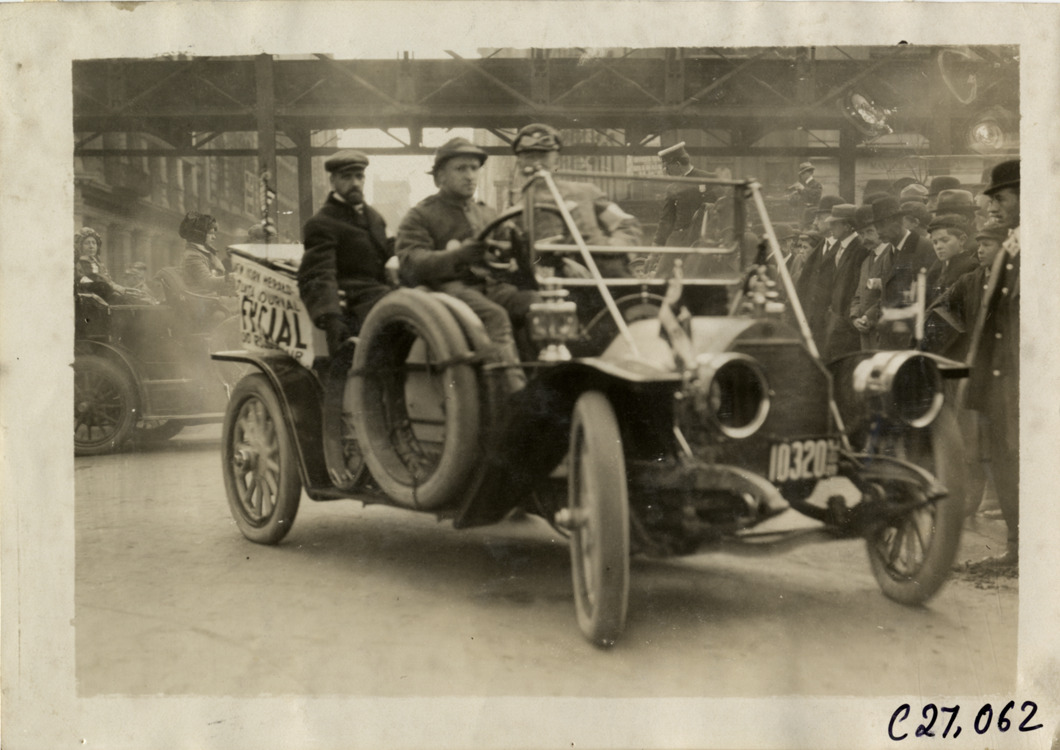 View of motorists posing in car during the 1909 New York to Atlanta Good Roads Tour. Stamped on back: "Photo by Spooner & Wells, Inc. 1931 Broadway, N.Y." Handwritten on back: "Tours--New York-Atlanta Good Roads Tour, 1909."