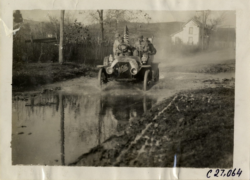View of motorists in White steamer on flooded stretch of road during the 1909 New York to Atlanta Good Roads Tour. Stamped on back: "Spooner & Wells, Inc., photographers, telephones 3472-3473 Columbus, 1931 Broadway, New York." Handwritten on back: "Tours--New York-Atlanta Good Roads Tour, 1909."
