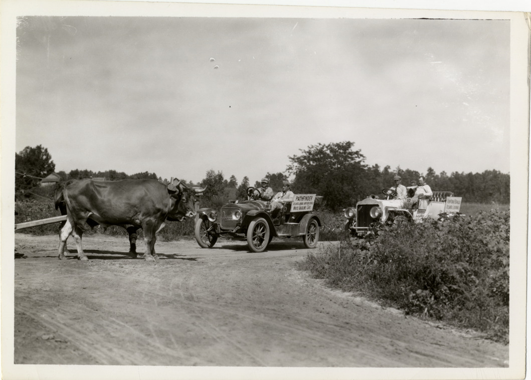 View of motorists in White gasoline pathfinder car and White steamer car approaching team of oxen on rural dirt road during the 1910 New York to Atlanta Good Roads Tour. Sign on gasoline car reads: "Pathfinder, Atlanta Journal, New York Herald, White gasoline car." Stamped on back: "Photographic illustration by Nick Lazarnick, 230 Park Ave., N.Y." Handwritten on back: "Tours--New York-Atlanta Good Roads Tour, 1910."